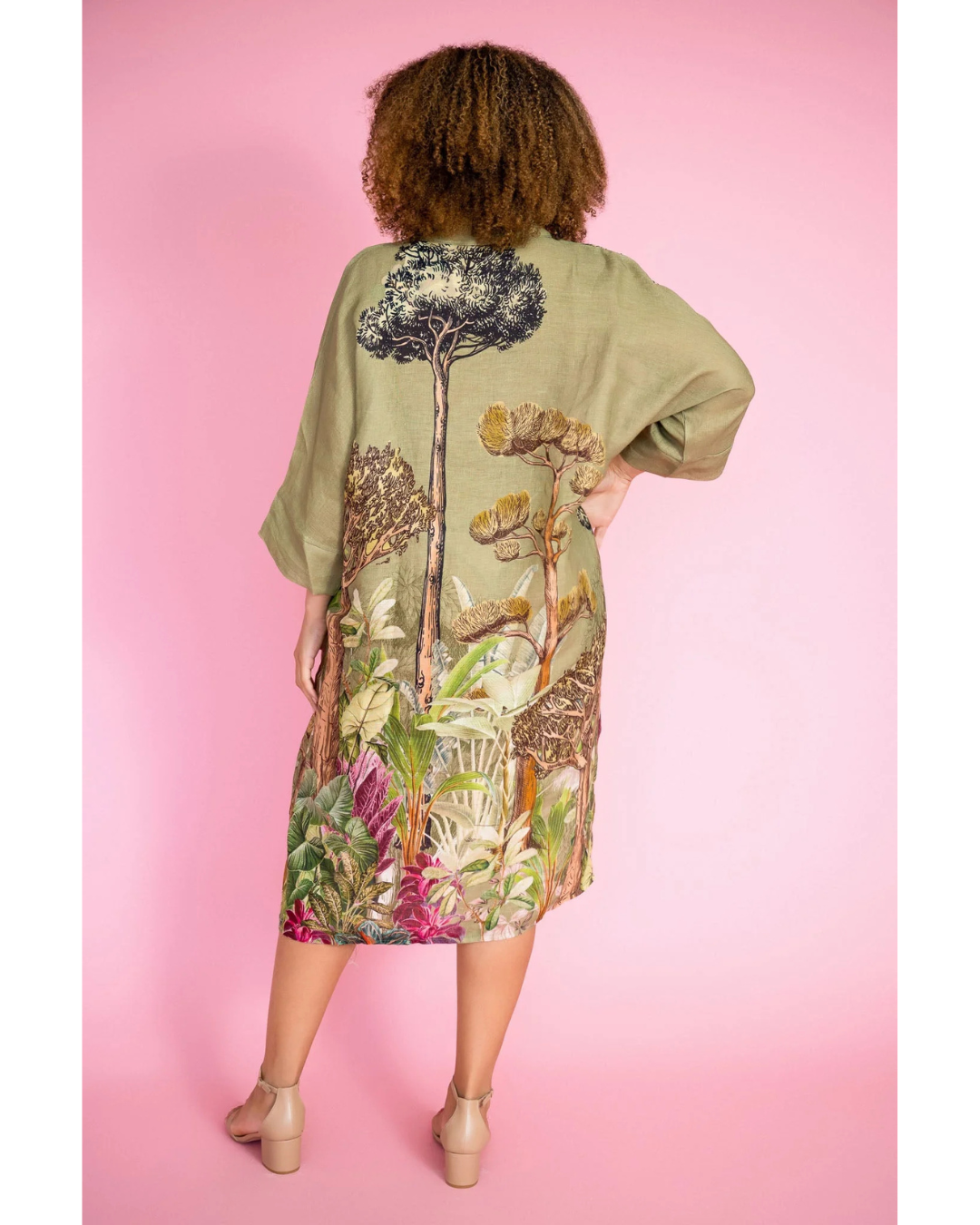 Discover effortless sophistication with the Sanctuary Dress in Khaki. This generously cut shirt dress features a relaxed silhouette with dropped shoulders, 3/4 length sleeves, and practical hip pockets. The soft collared neckline and button-front closure add timeless appeal, while the midi hemline creates a polished, understated look. Crafted from breathable Italian linen with an all-over Sanctuary print, this one-size-fits-most piece transitions seamlessly from casual daytime wear to elevated evening styling. Perfect for those seeking comfort without compromising on style.