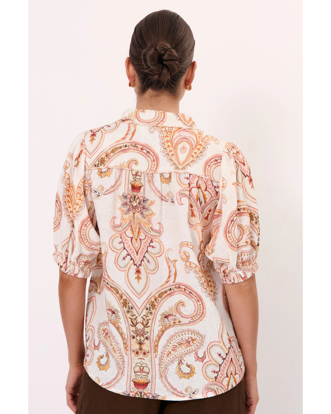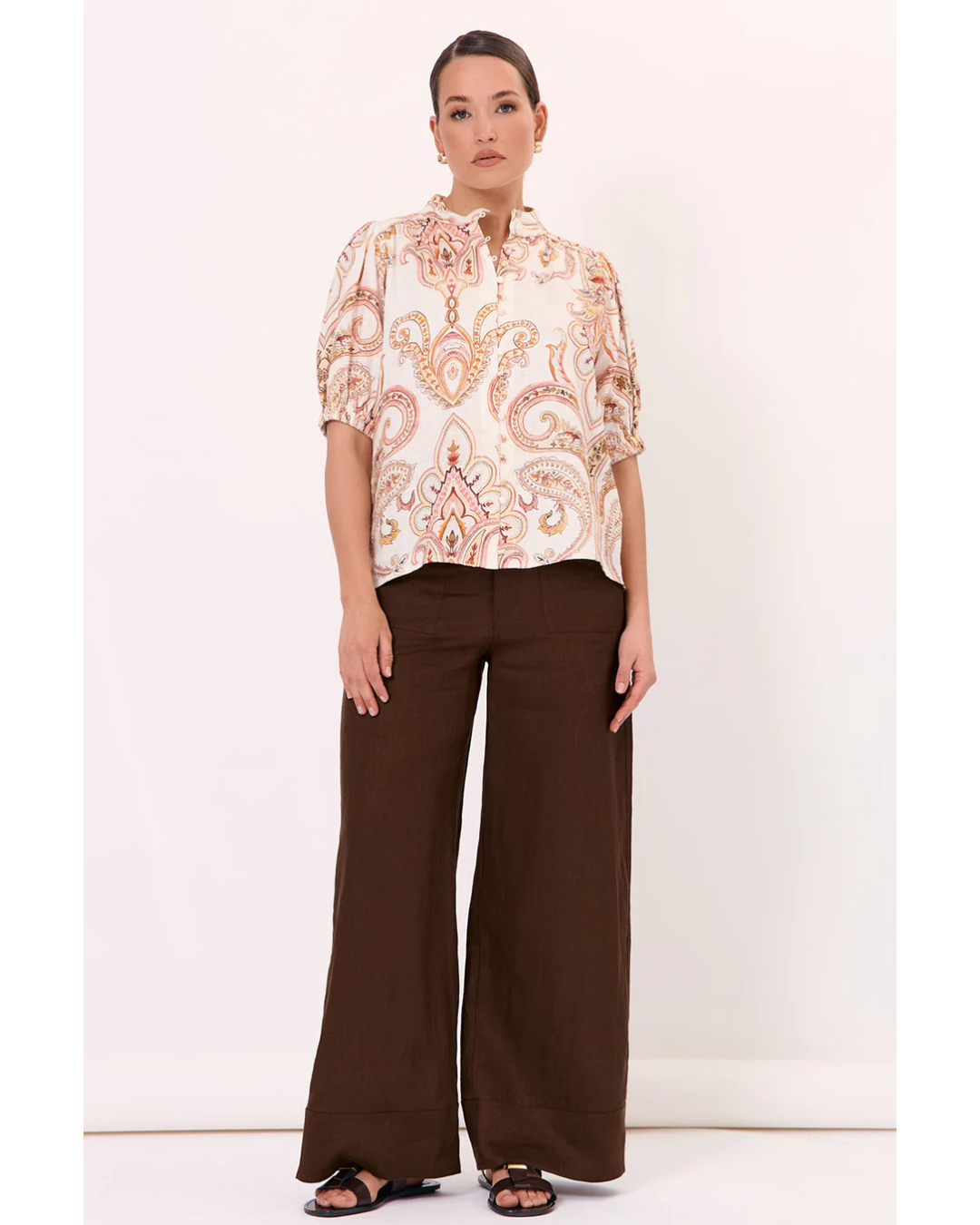 The Lilian Short Sleeve Linen Top showcases an exclusive adorne print on pure 100% linen, delivering effortless sophistication for warm weather dressing. Its mandarin collar and self-covered button-down front create a polished silhouette, while elasticated short sleeves and a structured back yoke provide refined detail. The relaxed fit ensures comfortable all-day wear without compromising on style. A versatile piece that transitions seamlessly from casual to smart-casual occasions.