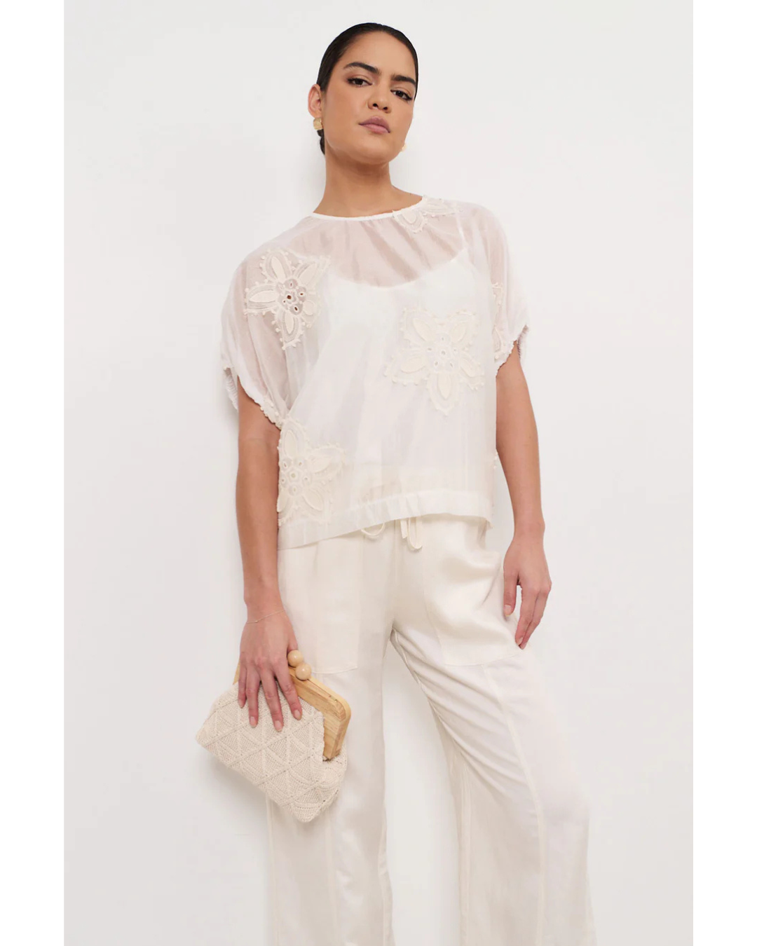 The Phoebe Appliqué Flower Top in Ivory combines intricate embroidered floral lace with understated elegance. Crafted from luxurious 100% rayon, this piece features a graceful round neckline and softly dropped shoulders for a contemporary silhouette. The button and loop back closure adds functional detail, while the included camisole provides layering flexibility and coverage. Its relaxed fit offers comfort, though sizing down delivers a more tailored appearance. An sophisticated choice for elevated casual styling.