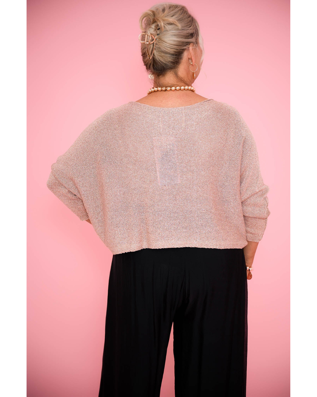 Chateau Knit Pink (OS) Step into the spotlight with our Chateau Knit in Pink – a glamorous statement piece that brings Hollywood sophistication to your winter wardrobe. This show-stopping knit transforms casual styling into red-carpet worthy elegance, perfect for those moments when you want to shine. Featuring a wide round neck and loose fit torso, this knit creates a relaxed yet polished silhouette with star-quality presence. The long, tapered sleeves and dropped shoulders add contemporary flair, while the ultra-lightweight construction ensures comfortable wear even during the most festive occasions. The luxurious lurex woven throughout the fabric creates a mesmerising golden shimmer that captures and reflects light with every movement. This opulent detail elevates any ensemble, whether layered over basics or worn as a standalone statement piece. Perfect for evening events, celebrations, or whenever you're ready to command attention with understated glamour.