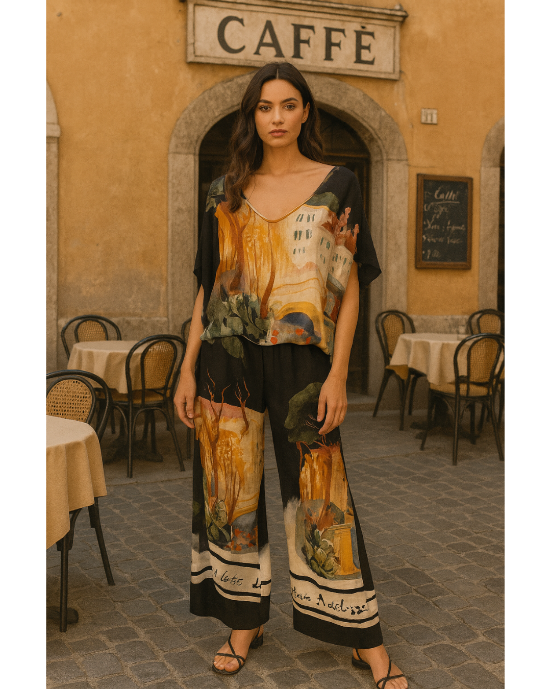 Elevate your wardrobe with this stunning Italian ensemble, a wearable work of art designed to capture the romance of Europe’s sun-drenched streets and timeless cafés. Crafted in a luxurious silk-viscose mix, each piece features a painterly French print that makes every outfit truly unique. Available to purchase together or as separates.