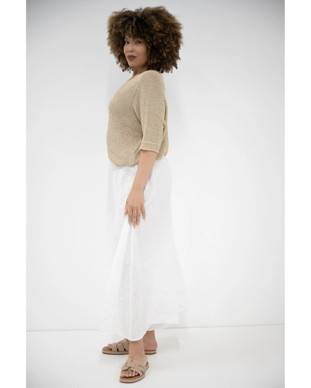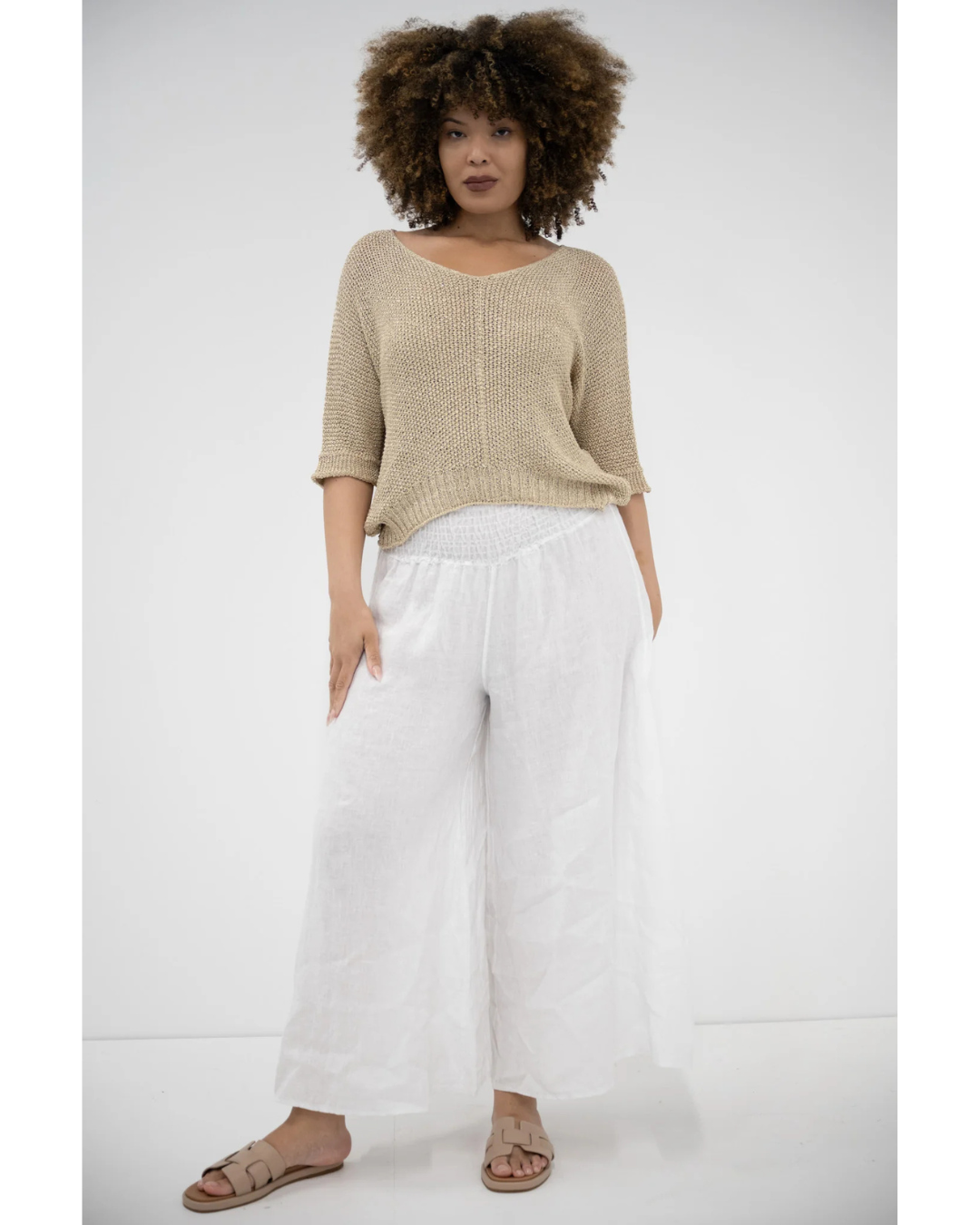 The Florence Top in Gold combines luxe shimmer with everyday wearability. Crafted from soft, stretch fabric with an open weave construction, it delivers both breathability and that coveted metallic radiance. The cropped silhouette and short sleeves create a contemporary line, while a flattering V-neckline and subtle front-back seaming provide gentle structure. Wide hems at the cuffs and waist offer a polished finish. Designed for versatility, this piece transitions effortlessly from evening occasions to layered daytime styling, bringing an instant luminous quality to any wardrobe.