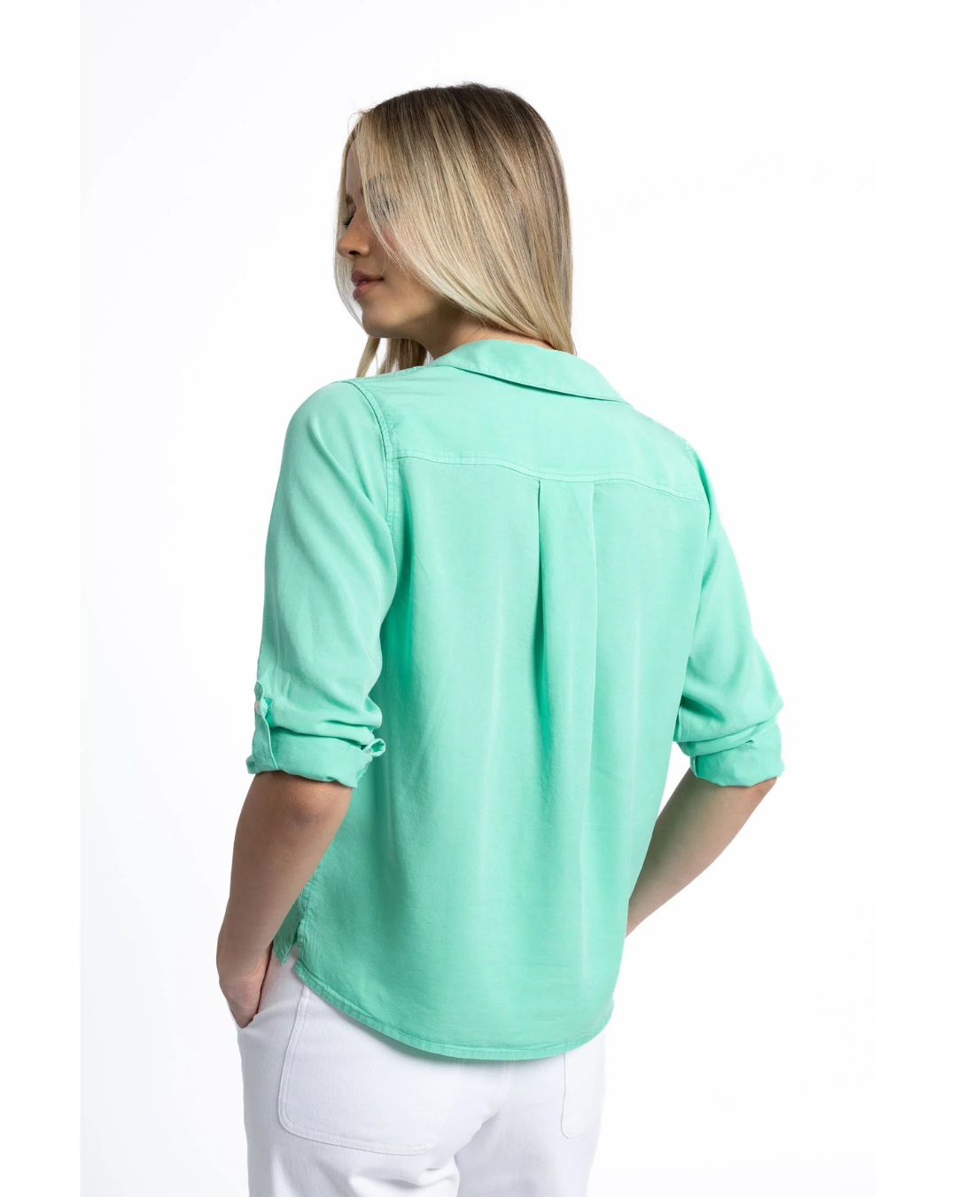 Crafted from 100% lyocell, the Humidity Leni Shirt in green offers exceptional softness and breathability, making it ideal for warm weather. Its collared, button-up V-neckline provides a polished look, complemented by shell button details and a practical front patch pocket. Designed for versatility, the full-length sleeves feature cuffs that can be buttoned or rolled up, adapting to your comfort needs. The shirt’s straight, roomy fit, enhanced by a back yoke with pleats, ensures ease of movement, while the curved hemline—with a slightly longer back—adds subtle style and improved coverage.