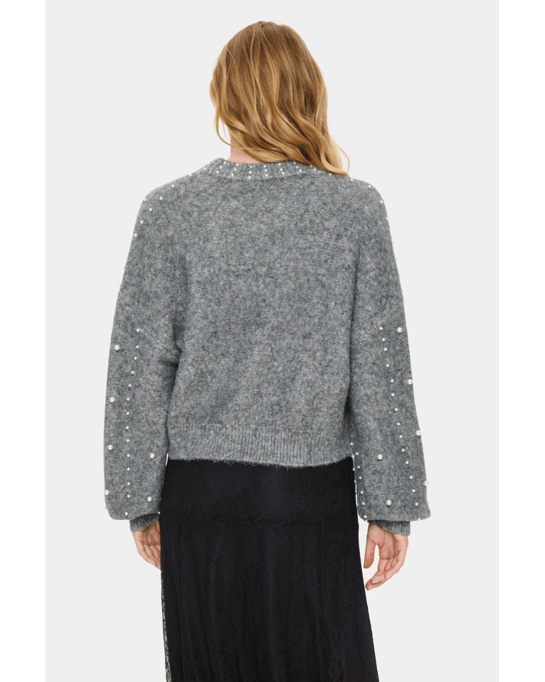 The Madeleine Pullover exemplifies contemporary knitwear design with its sophisticated gunmetal melange hue and thoughtfully curated details. This relaxed, slightly cropped silhouette features a round neckline and long sleeves adorned with decorative pearl embellishments that add refined visual interest. Constructed from a sumptuous blend of polyamide, acrylic, and wool, the soft, textured knit provides both comfort and durability, while ribbed edges at the hem, cuffs, and neckline ensure a polished finish. Versatile and effortlessly stylish, it layers beautifully over casual basics or professional pieces, making it an essential addition to any well-considered wardrobe.