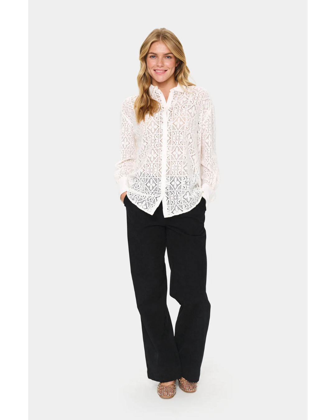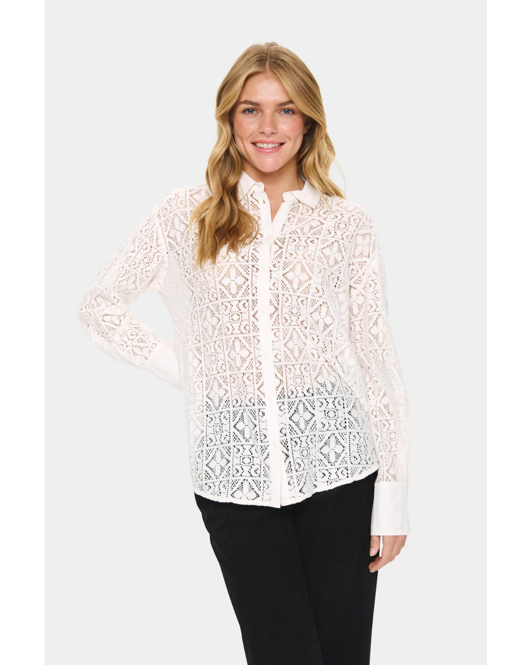 Discover refined sophistication with the Saint Tropez Martina Shirt, a masterclass in understated luxury. This long-sleeved lace piece in ice-white features an intricate geometric pattern that elevates any ensemble with subtle visual interest. The expertly tailored design combines a classic collar, front button closure, and precisely cuffed sleeves with a relaxed yet flattering silhouette that skims the body gracefully. Finished with a gently curved hem, the sheer, breathable fabric ensures comfort without compromising on polish. An investment piece that transitions seamlessly from day to evening, it's the discerning choice for those who understand that true elegance requires no effort.