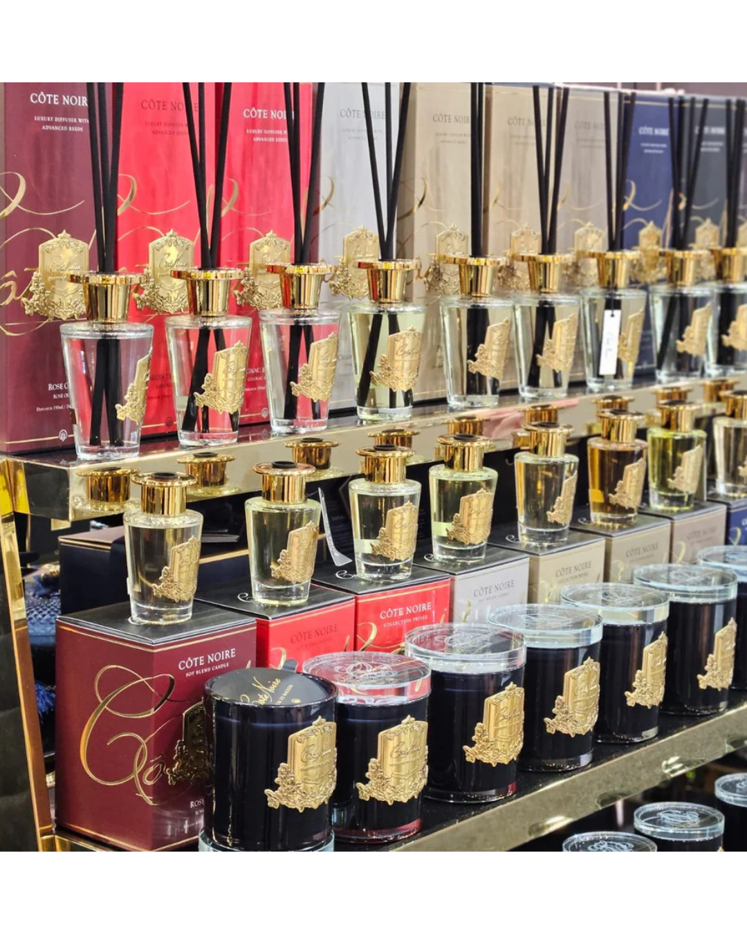 Indulge in the luxurious and eco-friendly Cote Noire 185g Candle - Dark Vessel with Gold Badge (Eau De Vie). Hand-poured from a blend of soy, coconut, and beeswax, it offers a healthier and greener alternative to paraffin wax. Inspired by the French countryside, the Eau de Vie fragrance exudes plum, davana flower, and patchouli notes, making it a delightful addition to any space. Complete with a crystal glass lid that doubles as a base, this candle is a must-have for any candle lover.