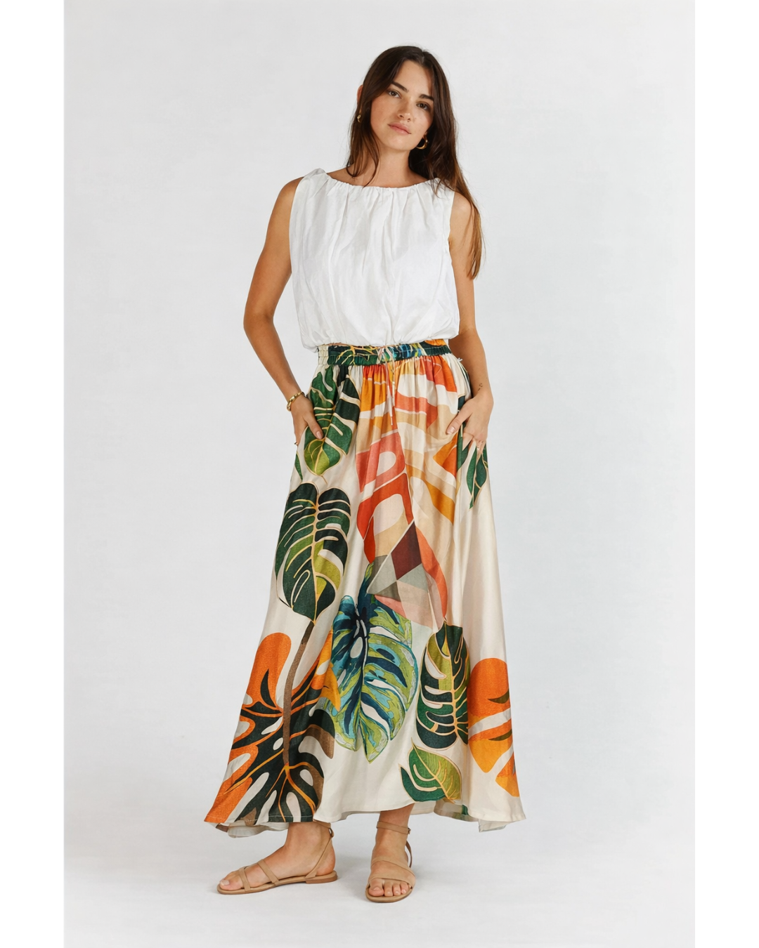The Itami Bleus Skirt in White is a sophisticated wardrobe essential crafted from luxurious 100% viscose satin that drapes beautifully against the body. This versatile piece features a comfortable elasticated waist and practical side seam pockets, making it effortlessly wearable from morning meetings to evening occasions. The elegant maxi length creates a refined silhouette that flatters all body types, while the fluid fabric ensures graceful movement. True to size and designed for those who appreciate quality construction and timeless style.