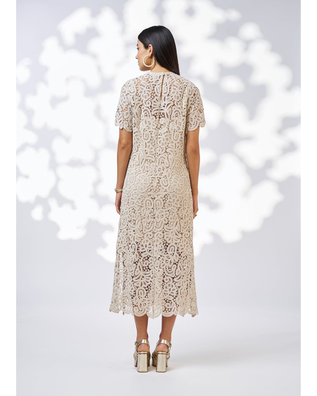 This Loobies Harlo Midi Dress in Stone offers a relaxed fit crafted with delicate crochet lace for a sophisticated, airy feel. Featuring a round neckline and short sleeves, it combines classic charm with modern ease. The included nude slip, with adjustable straps, bust darts, and side splits, ensures a comfortable, flattering silhouette beneath the lace overlay, making this dress ideal for stylish day-to-night wear.