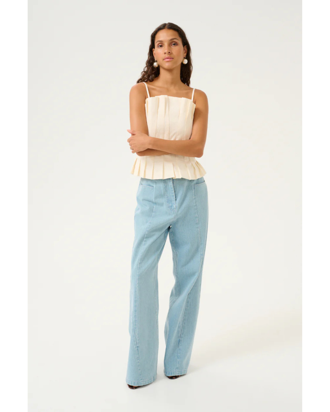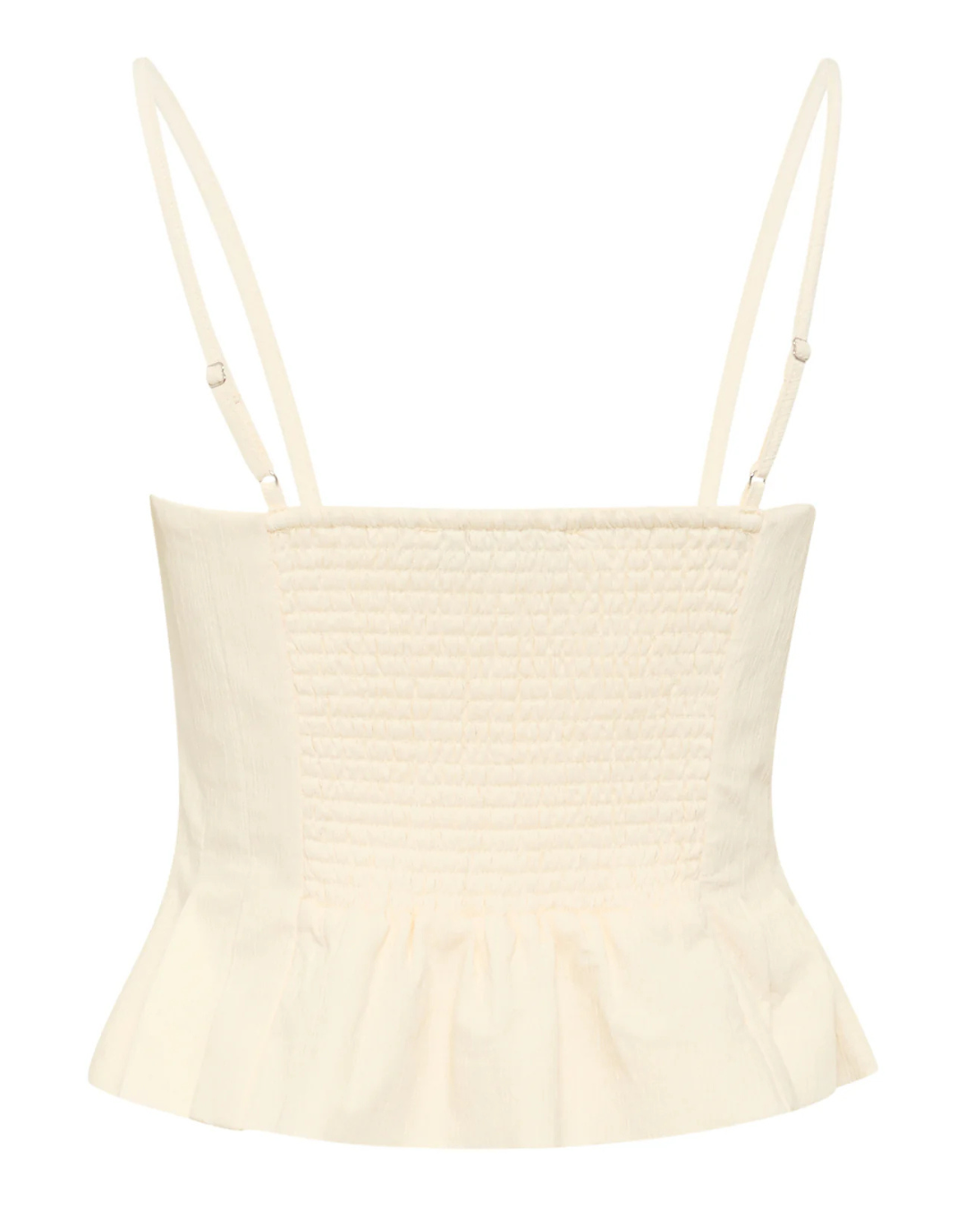 The Vala Top by Karen by Simonsen combines expert craftsmanship with breathable comfort, featuring a fitted smocked bodice that sculpts the silhouette. Its 50% linen and 50% viscose blend delivers lightweight wear with a subtle textured finish, while layered ruffles add dynamic movement and refined style. Designed sleeveless for versatile layering or standalone wear, this short-length beige top pairs seamlessly with high-waisted bottoms, making it an ideal choice for polished yet effortless summer looks.