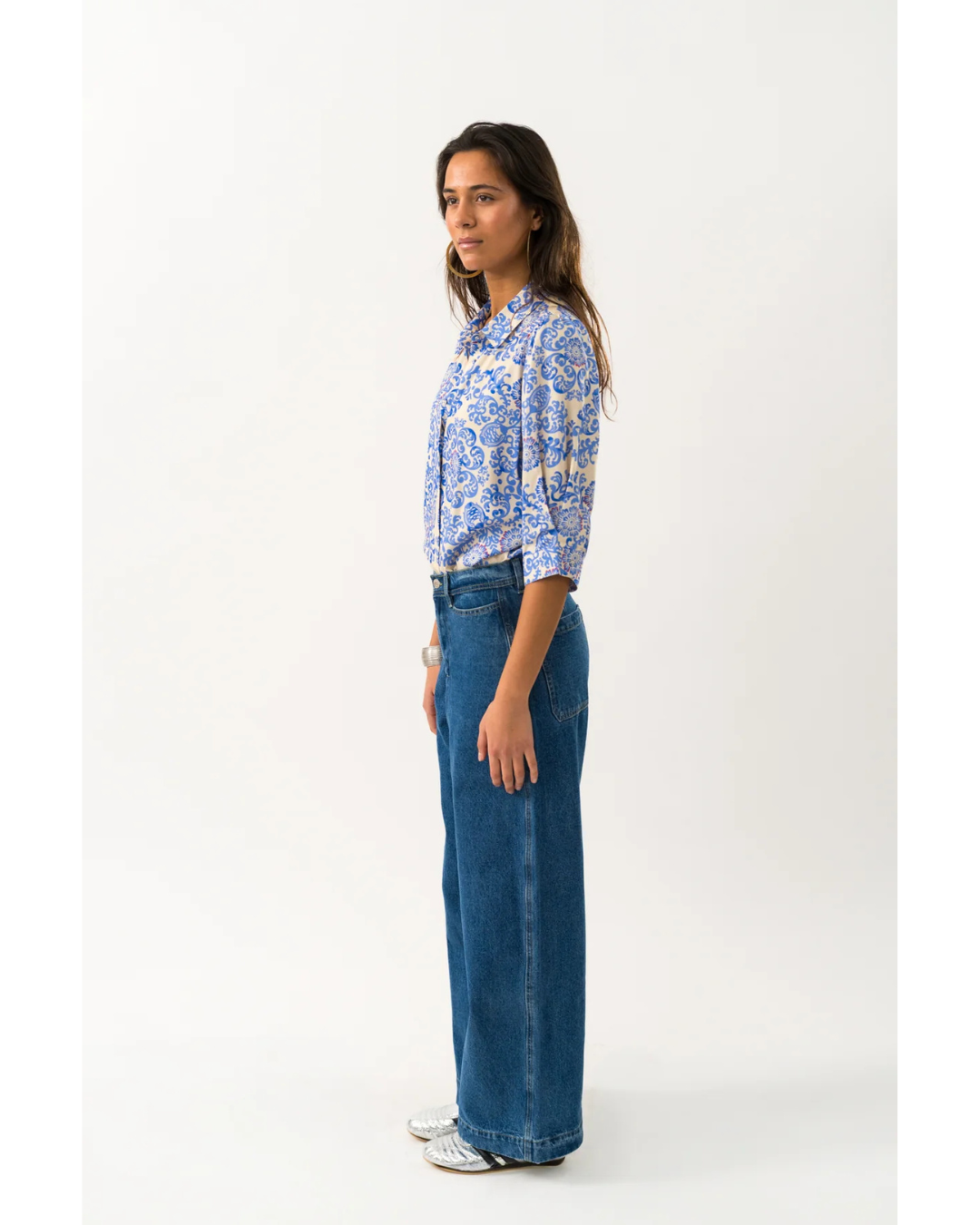 The BonoLL shirt is a wardrobe essential that effortlessly bridges casual and refined styling. Crafted from 100% lightweight viscose, this piece features a classic collar, front button closure, and distinctively flared ¾ sleeves with generous cuffs. The standout element is its sophisticated blue-toned print accented with subtle red details on a cream base—a design that has earned its place as a recurring collection favourite. The relaxed, comfortable fit works beautifully with denim or skirts, making it a versatile choice for those who appreciate timeless pieces with understated character.