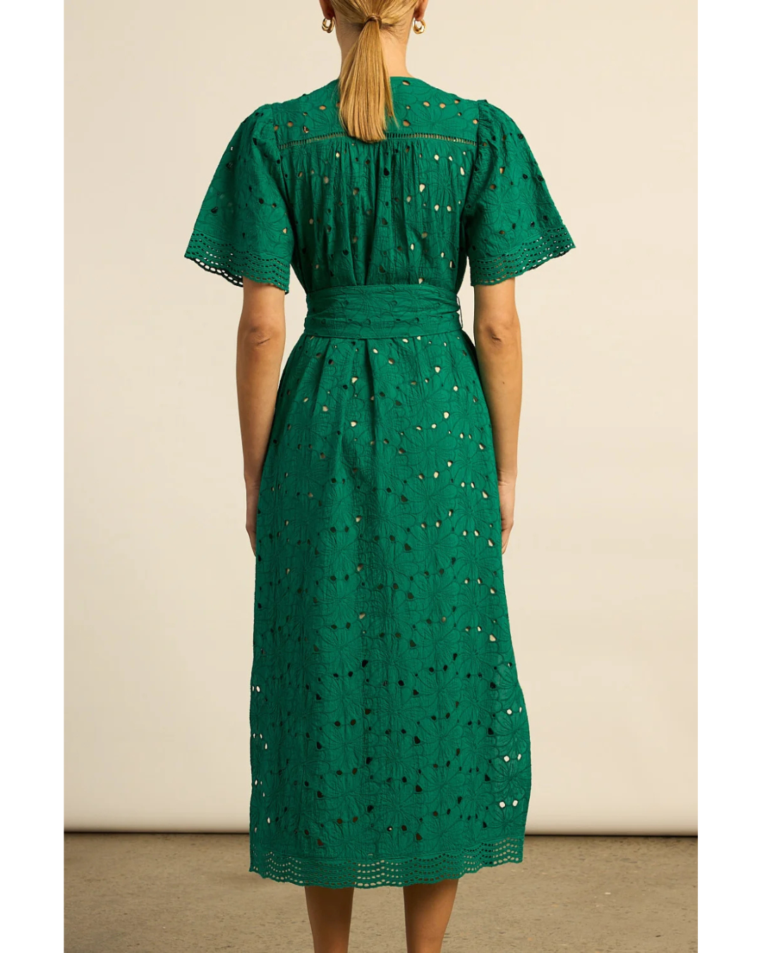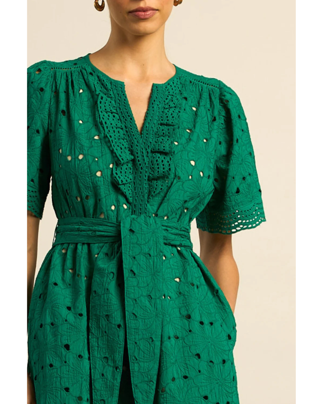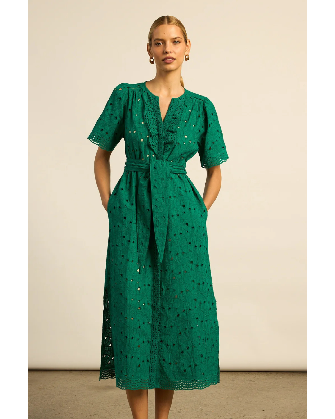 The Voyage Dress brings timeless sophistication to occasion wear in 100% cotton broderie. This midi piece features a rounded neckline elegantly finished with delicate lace ruffles, while floral-inspired broderie detailing and lace trims create visual richness throughout. A colour-matched cami provides layered coverage and styling flexibility. Practical side splits allow for ease of movement, while a wide self-tie belt cinches the waist for refined definition. Front button detailing from bust to hemline, finished with a covered placket, adds considered craftsmanship. Equally suited to garden gatherings or evening events, this dress balances elevated design with the versatility required for modern dressing.