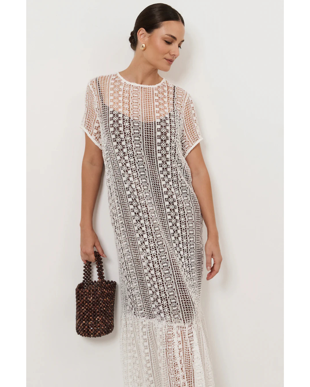 The Rio Lace Maxi Dress combines timeless elegance with contemporary design. Crafted entirely from delicate cotton lace, this piece features a flattering round neckline and short sleeves that frame the shoulders beautifully. The tiered hem creates graceful movement and dimension, while the button-loop back closure adds a refined finishing touch. A contrasting chocolate rayon slip provides comfortable coverage beneath the sheer lace. Perfect for warm-weather occasions, this dress is true to size and crafted from premium 100% cotton lace with a 100% rayon slip lining.