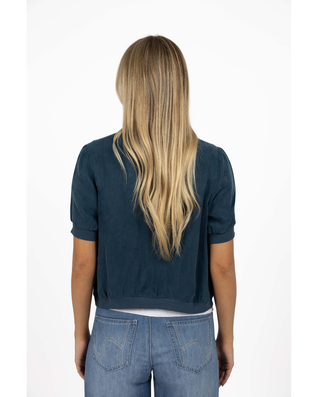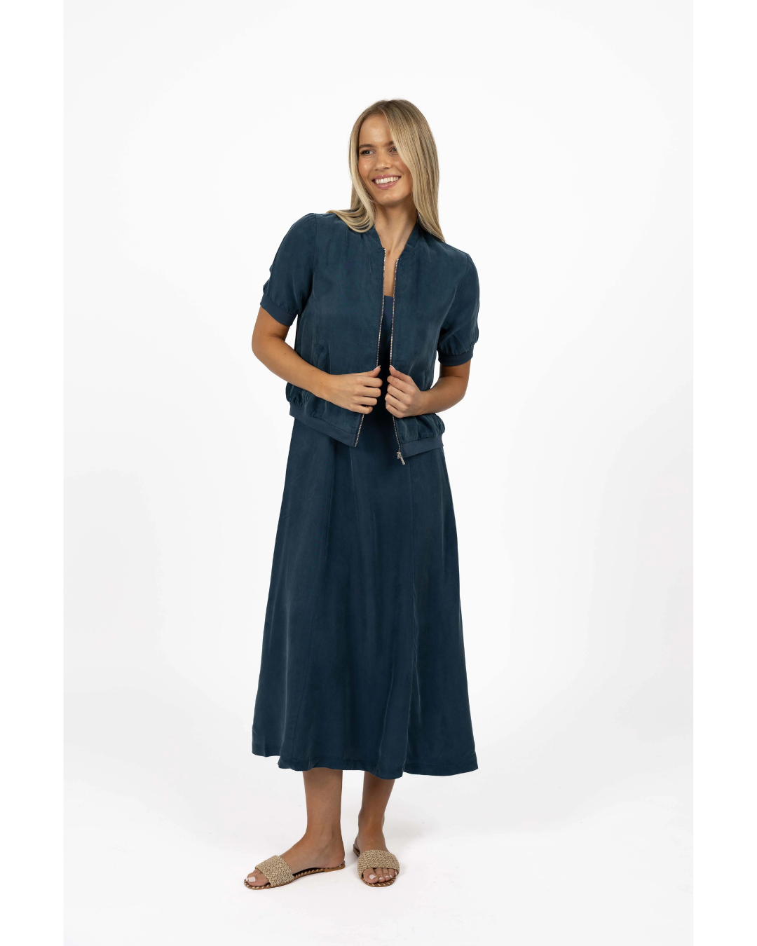 Elevate your summer wardrobe with the Humidity Harper Jacket in Navy. This short-sleeved jacket features a refined self-fabric mandarin collar and a smooth zip closure for effortless style. Crafted from a lightweight cupro blend, it offers a soft, velvet-like feel that mirrors silk’s luxury but with enhanced durability and ease of care. Ribbed hems and sleeve cuffs ensure a comfortable fit, while its flattering cut sits just above the hip. Available in five elegant colours, this piece combines sophistication with wearability for warm-weather elegance.