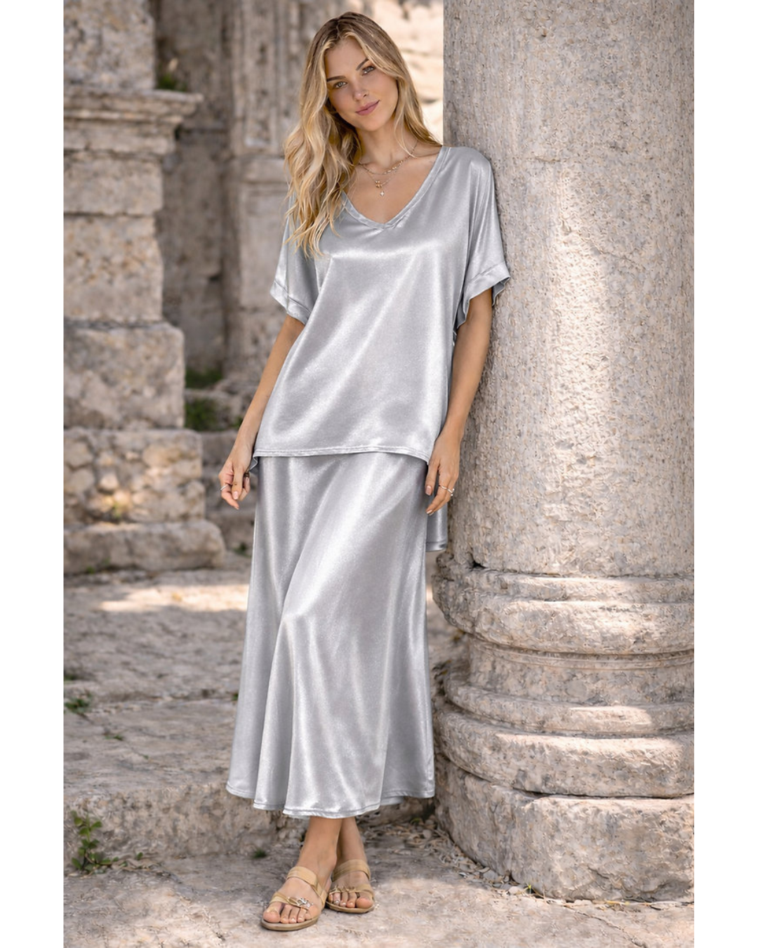 Colour: Silver Experience the elegance of L I L L I A N O with the Italian Satin classic Top. Embrace refined style and quality craftsmanship, brought directly from European ateliers to your wardrobe in New Zealand.
