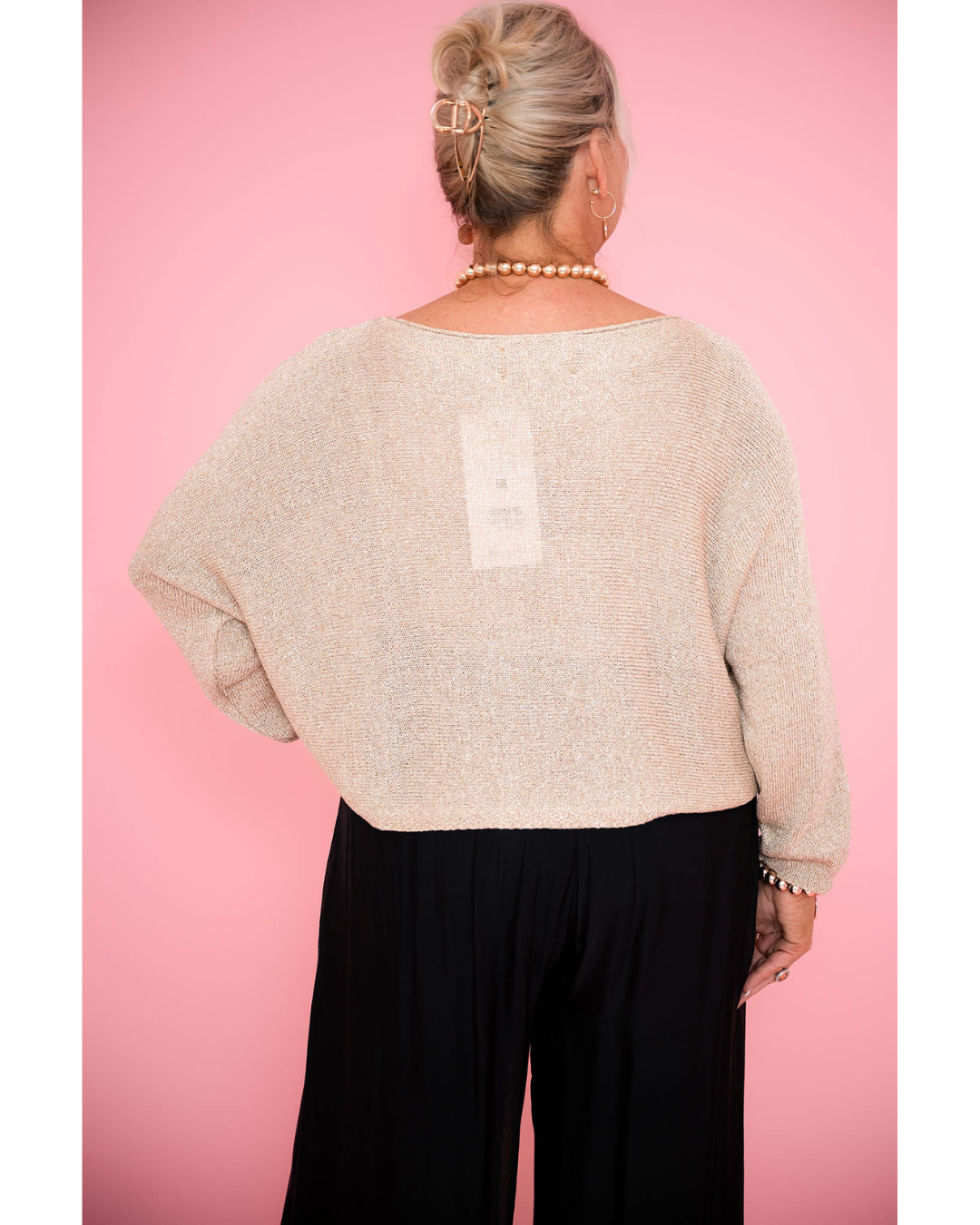 Chateau Knit Gold (OS) Step into the spotlight with our Chateau Knit in Gold – a glamorous statement piece that brings Hollywood sophistication to your winter wardrobe. This show-stopping knit transforms casual styling into red-carpet worthy elegance, perfect for those moments when you want to shine. Featuring a wide round neck and loose fit torso, this knit creates a relaxed yet polished silhouette with star-quality presence. The long, tapered sleeves and dropped shoulders add contemporary flair, while the ultra-lightweight construction ensures comfortable wear even during the most festive occasions. The luxurious lurex woven throughout the fabric creates a mesmerising golden shimmer that captures and reflects light with every movement. This opulent detail elevates any ensemble, whether layered over basics or worn as a standalone statement piece. Perfect for evening events, celebrations, or whenever you're ready to command attention with understated glamour.