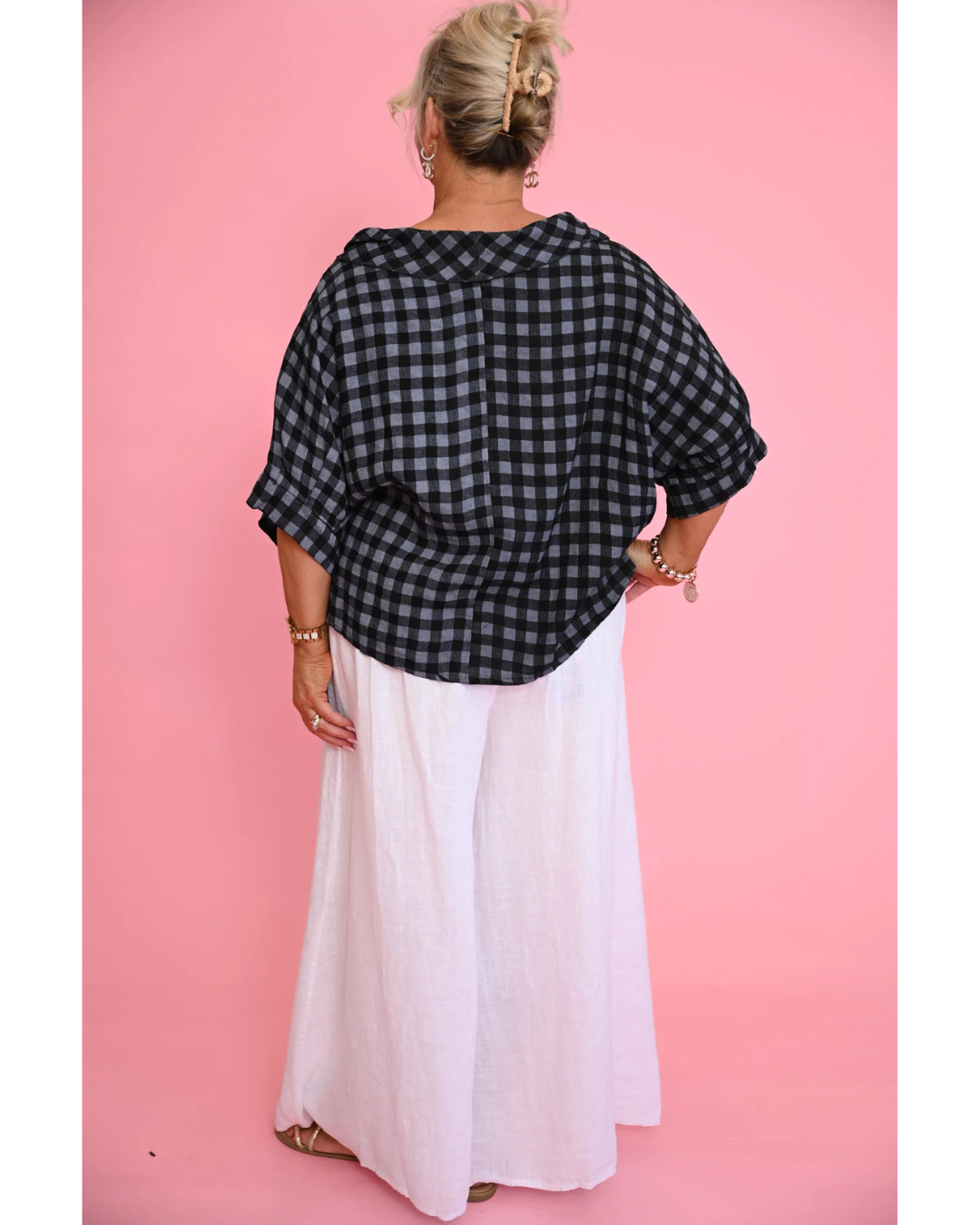 The Kayla Top exemplifies contemporary tailoring with its distinctive rolled collar and precisely cropped cut. Constructed from 100% Italian linen, this piece delivers exceptional breathability and a naturally structured drape that elevates any ensemble. The short sleeves feature elegantly pleated cuffs that introduce architectural interest without compromising wearability. Its black check pattern provides timeless versatility, seamlessly transitioning from casual to refined settings. Whether styled with tailored trousers or midi skirts, the Kayla Top functions as a sophisticated foundation piece that rewards thoughtful layering and demonstrates the enduring appeal of quality fabrication and considered design.