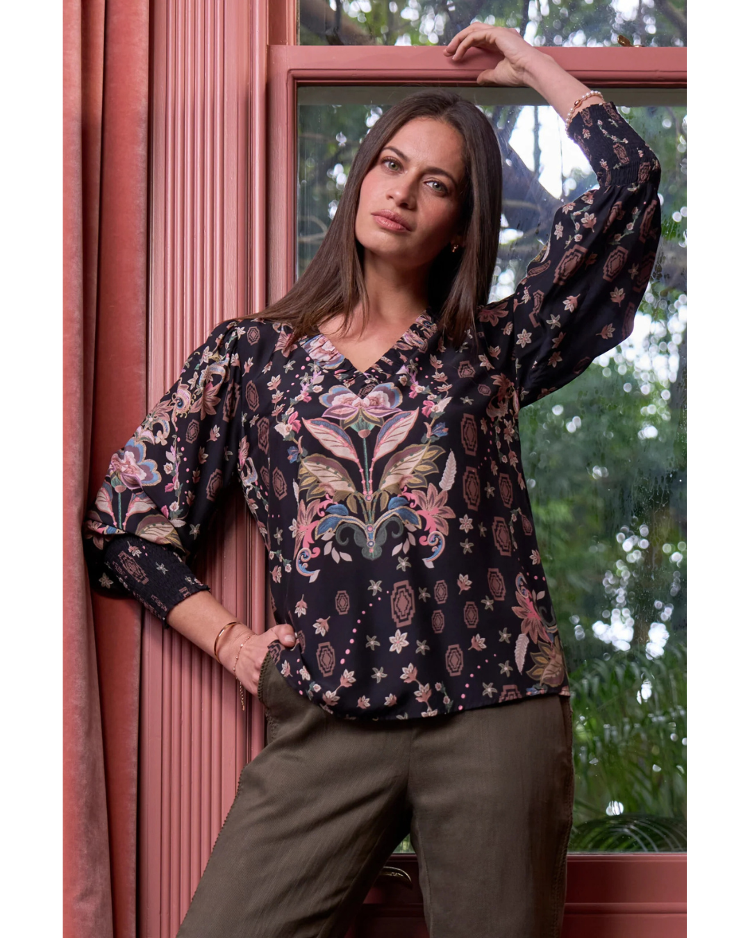 Elevate your wardrobe with the Antoinette Blouse, a luxurious silk blend creation designed for effortless sophistication. Crafted from 65% rayon and 35% silk, this blouse offers a sumptuous feel against the skin with natural drape and breathability. The striking ruched V-neckline draws attention to your décolletage, while voluminous blouson sleeves create a romantic, feminine silhouette. Deep shirred elasticated cuffs gather the sleeves for a polished finish that transitions seamlessly from day to evening. Perfect for layering or wearing solo, this versatile piece brings understated luxury to any occasion.