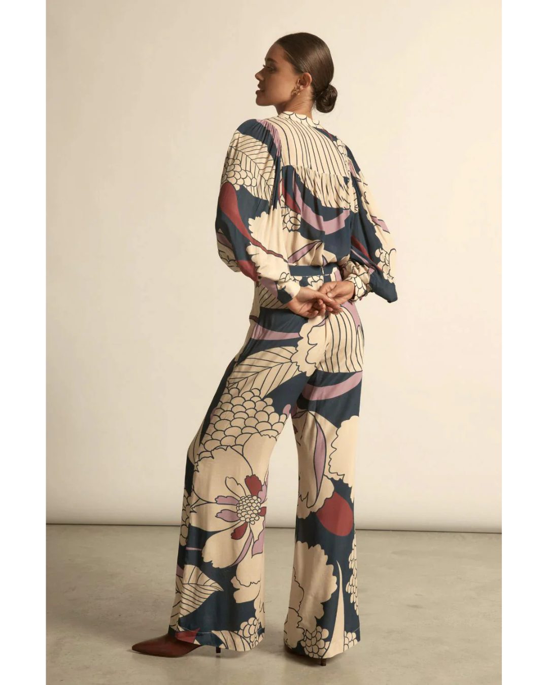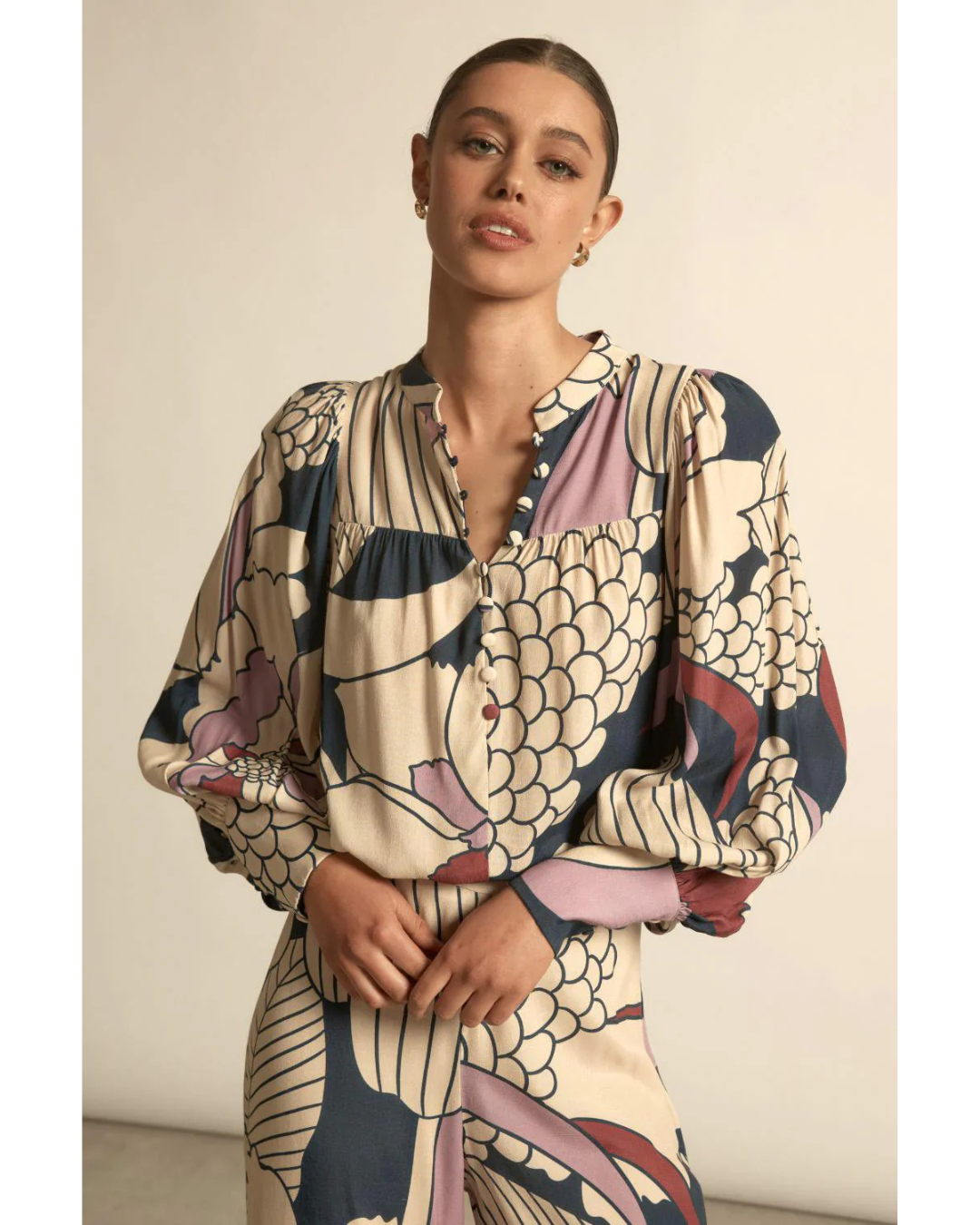 The Vista top is a refined transitional piece designed to anchor your autumn–winter wardrobe with understated sophistication. Constructed from 100% ramie, this staple silhouette features sculptural blouson sleeves finished with a deep cuff and a subtle mandarin collar that adapts to multiple styling approaches. Strategic gathers across the front and back yoke provide ease of movement while maintaining a polished line when paired with structured bottoms.